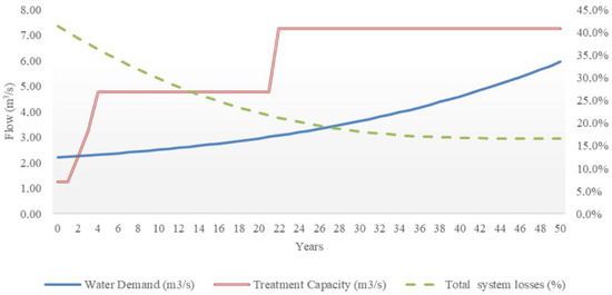 Benefits of water demand management (WDM) can also impact the management of the new water supply system in Santa Marta. If demand reduction is incentivized, several benefits, such as the previously mentioned benefits and the deferment of PWTP expansions, are expected over time. Thus, future studies should articulate efforts of various stakeholders to evaluate which structural and non-structural measures or combination of measures will be more efficient to reduce the per capita demand in the city. Demand reduction is a continuous water management issue throughout the project lifecycle; however, a fixed demand value was required for the initial planning stage in Santa Marta City.