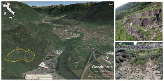 (a) Study area as situated in the Valcamonica valley (Google Earth snapshot, yellow outline), and its location in Italy (inset map); (b,c) examples of field-observed terrace failure present in the study area (photographs by M. Tosoni).