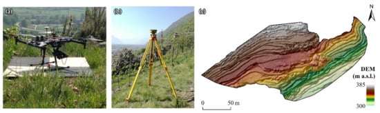 The Valcamonica valley at the foothills of the Italian Alps represents a typical example of an ancient terraced vineyard production system. Currently, the wine production industry is being restored after a period of widespread abandonment [16]. Land degradation is evident as the old terraced systems have been widely overgrown, eroded and collapsed [17]. Precise and accurate topographic information is of key importance for a structural design of terrace systems, in order to safeguard their drainage functioning and mitigating hydrogeologic risks in the face of increasing high-intensity rainstorms [18].