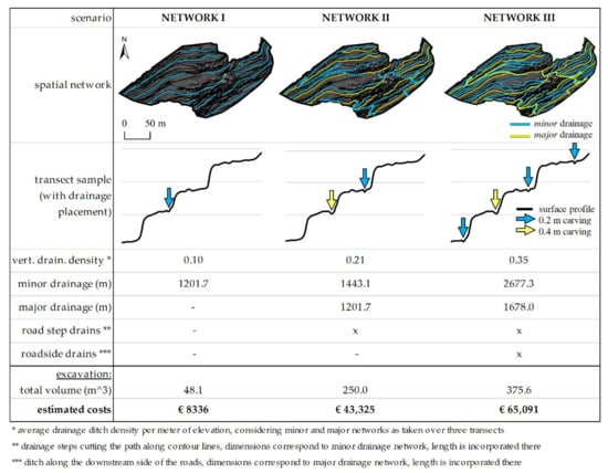 Simple cost estimations for excavation show a clear variation among the scenarios (Figure 3), almost reaching one order of magnitude. As Network I comprises only minor ditches (0.2 × 0.2 m), the costs of €8336 are relatively low. Network II, with doubled drainage density and length, results in higher costs of €43,325, due to the quadrupling of the cross-sectional area in parts of the network (minor to major, i.e., 0.2 × 0.2 to 0.4 × 0.4 m). Further expansions of Network III result in cost estimation of €65,091. In terms of benefit, the previous sections have pointed out several examples where network expansion did not necessarily yield substantial profits, for example, at zone C after Network I. Contrastingly, certain critical issues could not efficiently be resolved, e.g., where topographic depressions exist on terrace benches, and a careful redesign supported by field inspection is encouraged in this case. Economic benefits could be quantified in further studies, for example, by estimating the saved costs related to soil loss and terrace reconstruction.