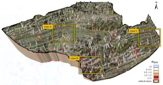 Figure 4 shows the RPII calculated for the Valcamonica study area in its current state. Critical zones (>, reddish colours) are typically related to flow concentration by roads and terraces, and subsequent release at topographic interruptions, increasing the risk of soil erosion. Three critical zones (Figure 4, zones A–C) are highlighted for comparison of potential flow concentration and the effect of the different drainage network scenarios. The selection of these zones was based on the presence of critical patterns and field evidence of terrace damages (not considering the central part for possible disturbance by remaining vegetation).