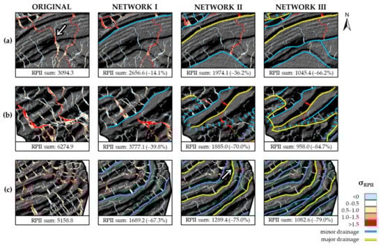 (a–c) Relative Path Impact Index (RPII) maps computed for current conditions (original) and for three drainage scenarios (Networks I–III) for zones A–C, respectively. For each combination, summed positive RPII values are displayed along with the relative change in respect to the original state in percentage.