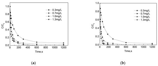 As can be seen from Figure 2a,b, the concentration of OFL gradually decreases with the increase of the reaction time. One can see that the effect of the initial total free chlorine concentration on the degradation of OFL is significant both in the pipe network and deionized water. When the free chlorine concentration is 0.7 mg/L, 1.0 mg/L and 1.3 mg/L, the removal rate of OFL can reach more than 90% after 5 min in the pipe network, while the removal rate can only reach 80% at a free chlorine concentration of 0.3 mg/L. After a 10 min reaction time, when the initial total free chlorine concentration increased from 0.3 mg/L to 1.3 mg/L, the removal rates were 91.7%, 96.8%, 100%, and 100%. In the deionized water, the removal rate of OFL reaches 100% at 3 min when the concentration is 1.3 mg/L. When the initial total free chlorine concentration increased from 0.3 mg/L to 1.3 mg/L, the removal rate was 94.5%, 100%, 100%, and 100%. The comparison shows that the degradation rate of OFL in the deionized water is higher than that in the pipe network. The rationale behind this finding is that organic matter, pipe scale and biofilm in the pipe network consume part of the free chlorine, which reduces the proportion of total free chlorine used for the degradation of OFL in the pipe network.