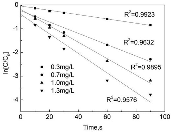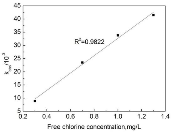 The experimental data obtained from the degradation of OFL in deionized water at different free chlorine concentrations were fitted with the pseudo first-order reaction Kinetics equation, with results shown in Figure 3. One can see that the linear relationship between ln[C/C0] and the reaction time is strong. This indicates that the reaction of the OFL chlorination by free chlorine (OOFC) is a first-order reaction. Figure 4 shows that a strong linear relationship can be observed between the pseudo first-order reaction rate constant (kobs) and the free chlorine concentration, indicating that the reaction between the free chlorine concentration and OFL conforms to the second-order kinetic model. kobs is the slope obtained by the linear fitting ln[C/C0] and the reaction time T, and a larger kobs value indicates a faster reaction rate.