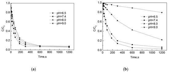 Figure 5a,b shows that the degradation rate of OFL is the fastest under neutral conditions, and that the relative removal efficiency is relatively low under acidic conditions, followed by the lowest rate under alkaline conditions. In the pipe network, after the reaction of 5 min, the removal rates of OFL are 89%, 92.7%, 86.5% and 83.6% at pHs of 6.5, 7.4, 8.0, and 9.0, respectively. In the deionized water, the removal rates of OFL were 80%, 85.7%, 37.7%, and 6.9% at pHs of 6.5, 7.4, 8.0, and 9.0, respectively. One can see that the pH value has a significant effect on the OOFC, and that the degradation rate of OFL in the pipe network is faster than in the deionized water. This may be due to some substances in the water and pipe scale that can promote the degradation of the OFL chlorination. When pH ≤ 7.4, both the degradation rate of OFL in the pipe network and in the deionized water are faster. When pH = 7.4, the removal efficiency of OFL is the highest, while at pH = 9.0 the removal efficiency of OFL is the lowest. This is because the pH has a combined effect on the presence of sodium hypochlorite and the presence of OFL. The OFL is an amphoteric compound, and the OFL has a different dissociation in water in different pH conditions. The OFL mainly exists in the form of OFL+ under acidic conditions, in the form of OFL0 under neutral conditions, and in the form of OFL− under alkaline conditions. When the pH is 6.5 and 7.4, the chlorination reaction rate is mainly determined by hypochlorous acid (HOCl) and OFL. When the pH is higher than 7.4 and the concentration of HOCl decreases, the main participation in the reaction is ClO−. As the ClO− chlorination is weaker than HOCl [], the reaction rate is reduced.