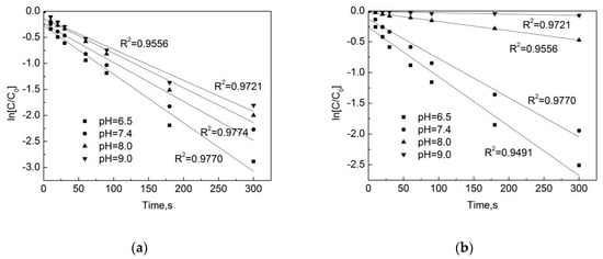 As shown in Figure 6, in the pipe network, when the pH is 7.4, the pseudo first-order rate constant is the highest, with a kobs = 0.0084 s−1, and when the pH is 9.0 the pseudo first-order rate constant is the lowest, with a kobs = 0.0061 s−1. In the deionized water, when the pH is 7.4 the pseudo first-order rate constant is the highest, at kobs = 0.0048 s−1, and when the pH is 9.0 the pseudo first-order rate constant is the lowest, at kobs = 0.0002 s−1. One can see that there is a significant difference in the degradation rate of OFL chlorination under different pH conditions in the pipe network and deionized water, and the difference in degradation is even greater under alkaline conditions. This is because as the increase of pH, substances in water and pipe scale can promote the degradation of OFL.