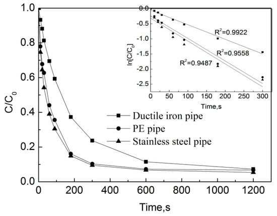 Figure 7 shows that after the reaction of 3 min, the removal rates of OFL in the ductile iron pipes, PE and stainless-steel pipes were 62.9%, 83.9%, and 85.1%, respectively. After the reaction of 20 min, the removal rates of OFL in the ductile iron pipes, PE and stainless-steel pipes were 92.7%, 93.2% and 94.6%, respectively. The pseudo first-order rate constants of OFL in the ductile iron pipes, PE and stainless-steel pipes are kobs = 0.0048 s−1, 0.0075 s−1 and 0.0076 s−1, respectively. One can see that the degradation rate of OFL in the ductile iron pipes is the slowest, while the rate of degradation in the PE pipes is similar to that in the stainless-steel pipes. By observing the visual pipe segment within the pipe network (i.e., the transparent segment of each pipe), the pipe scale in the stainless-steel pipe network is the highest, followed by the PE pipe, and the ductile iron pipe is the lowest. The analysis of the water in the three pipe networks shows that there is a small amount of iron ions in the water of the stainless-steel pipe network. According to the previous study [], Fe2+ could react with free chlorine to produce Fe3+, and the chlorination process produces some free radicals []. This might be one reason that results in a faster degradation of OFL in the stainless-steel pipe compared to the one in the other two pipes. By considering the effect of iron ions and the pipe scale, the degradation rate of OFL in the PE pipes is approximately equal to that in the stainless-steel pipes, while that in the ductile cast iron pipe network is the slowest.