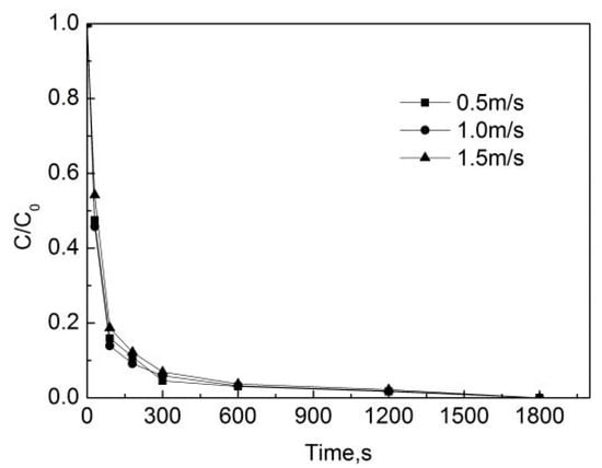 Since the effect of different flow rates on the degradation of OFL is only present in the pipe network, the PE pipes were chosen and the degradation in the deionized water is not considered. Therefore, in order to study the effect of different flow rates on the degradation of OFL, the initial free chlorine concentration was 0.3 mg/L, the concentration of OFL in the initial pipe network was 250 μg/L, the temperature was 20 °C, the pH of the pipe network was 7.4, and the flow rates were 0.5 m/s, 1.0 m/s, and 1.5 m/s.