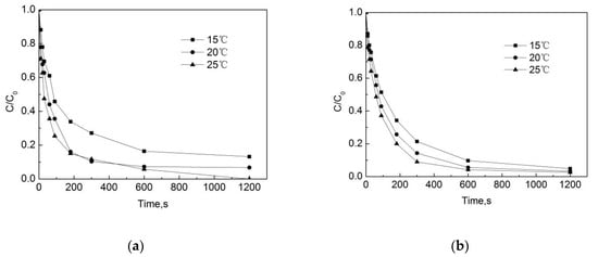 Figure 9 shows that the temperature has a significant effect on the degradation of OFL both in the pipe network and in the deionized water. The degradation rate continues to rise as the temperature increases from 15 °C to 20 °C. After 90 s, the removal rates of OFL in the pipe network were 48.6%, 57.2%, and 63.9%, and those in the deionized water were 54.2%, 64.4%, and 74.6%. As shown in Figure 10, as the temperature increases, the degradation rate in both conditions increases. This is because, when the temperature rises, the average kinetic energy and activation molecular weight of the molecule in the reaction system will increase, resulting in an increase in the number of effective collisions of molecules during the reaction process, as a result of which the chlorination reaction rate will be accelerated. However, we also note that at the same temperature, the degradation rate of OFL in the pipe network is slightly lower than that in the deionized water. In the pipe network, when the reaction temperature rises from 15 °C to 25 °C, the degradation rate of OFL increases from 0.0057 s−1 to 0.0085 s−1, while it rises from 0.0059 s−1 to 0.0099 s−1 in the deionized water. This is due to the water organic matter, pipe scale, and pipe wall microorganisms, which consume a certain amount of free chlorine and reduce the free chlorine for the OFL chlorination.