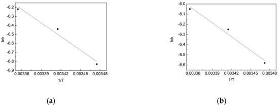 To find out the effect of the temperature on the reaction, lnk and 1/T were fitted according to the Arrhenius equation, and the results are shown in Figure 11. According to the Arrhenius equation: