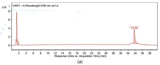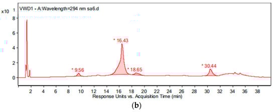 The chromatogram of the water sample at reaction times of: (a) 0 h and (b) 24 h.