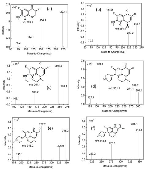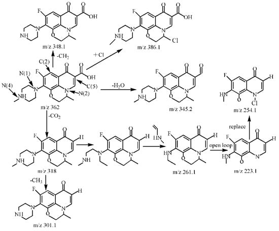 After further analysis of its chlorination products, it is found that the piperazine ring is one of the main groups involved in the reaction, and the main point involved in the chlorination reaction is the N4 atom on the piperazine ring. It loses one-CH3 to form the chlorination product M-61(the mass ratio is 301), continues to act on the N4 atom on the piperazine ring, and removes C3H7N to form the chlorination product M-101 (the mass ratio is 261.1). The chlorination product M-139 is formed by the ring opening of oxazine (the charge ratio is 223.1). The N2 atom on the quinolone ring is replaced by Cl to form the chlorination product M-108 (the charge-to-charge ratio is 254.1).