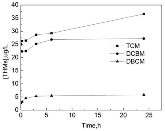 The formation curves of three kinds of THMs detected in the experiment are shown in Figure 15, which are trichloromethane (TCM), monobromodichloride (DCBM) and dibromodichloride (DBCM). It can be seen that THMs in the raw water mainly exist in the form of TCM. The concentration of three THMs increases significantly with the increase of the reaction time in the first 6 h. After 6 h, the concentration of DCBM and DBCM increases slowly while the concentration of TCM still increases significantly. After 24 h, the concentrations of TCM, DCBM and DBCM are 36.61 μg/L, 27.23 μg/L, and 5.808 μg/L, respectively.