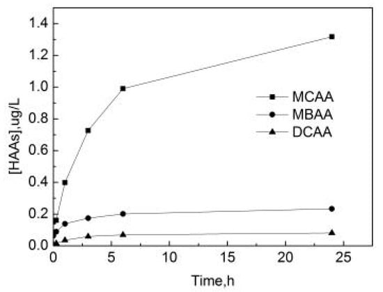 - As the reaction time increases, the concentrations of THMs and HAAs will gradually increase. THMs mainly exist in the form of TCM, and HAAs mainly exist in the form of MCAA.