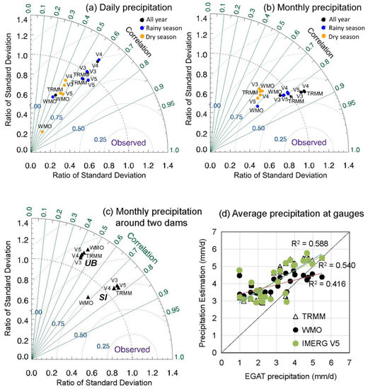 Taylor diagram of daily and monthly statistics among the multi-satellite retrievals for Global Precipitation Measurement (IMERG) V03, IMERG V04, IMERG V05, Tropical Rainfall Measuring Mission (TRMM), and World Meteorological Organization (WMO) interpolation grids from 12 March 2014 to 31 January 2016: (a) Daily precipitation during rainy season, dry season, and for the whole period. (b) Monthly precipitation during rainy season, dry season, and for the whole period; (c) monthly precipitation around two dams; (d) total precipitation at each gauge.