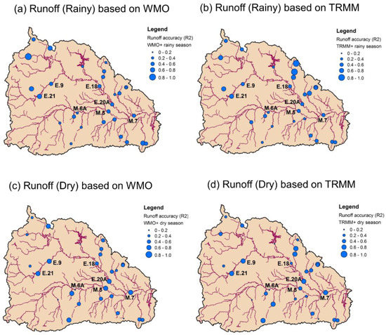 The correlation (R2) map of monthly runoff with observations from 2003 to March 2008 show that the average correlation (R2) during rainy seasons (Figure 4a,b) 0.493–0.530 are higher than those during dry seasons 0.452–0.478 (Figure 4c,d). The average R2 at 22 stations in tributaries for Figure 4 are 0.495, 0.540, 0.430, and 0.435, respectively. TRMM greatly improves the runoff accuracy in tributaries. The average R2 at seven mainstream stations are 0.488, 0.497, 0.629, 0.507. WMO is better than TRMM during dry season (Figure 5a). E.21 and E.9 upstream stations with similar drainage areas have similar correlations (R2). E.18, M.5, and E.20A with similar drainage areas have similar correlations (R2). The correlation (R2) for the E.21. and E.9 upstream stations are higher than for M.7, E.18, M.5, and E.20A. The R2 downstream values show a slight increase with the expansion of the drainage area. However, the simulated runoff at M.6A has a very weak correlation with the observations.