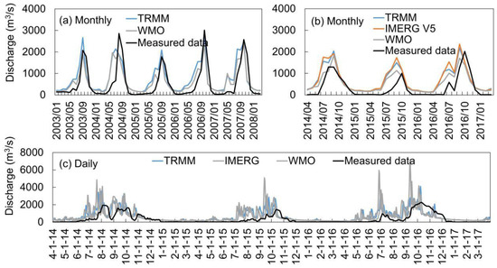 At the M.7 hydrological station, the Nash–Sutcliffe efficiency coefficients (NSE) of monthly simulated runoff from 2003 to March 2008 by the TRMM and WMO (Figure 6a) were 0.509 and 0.628, respectively. From April 2014 to March 2017, the NSE of monthly simulated runoff by the TRMM, IMERG V5, and WMO (Figure 6b) were 0.041, −0.166, and 0.508, respectively. The WMO demonstrated a relatively higher simulation accuracy than the TRMM. There is a time delay of the flood peak of measured daily runoff compared to the simulations (Figure 6c).The NSE of daily simulated runoff by the TRMM, IMERG V5, and WMO were −0.354, −0.984, and 0.066, respectively.