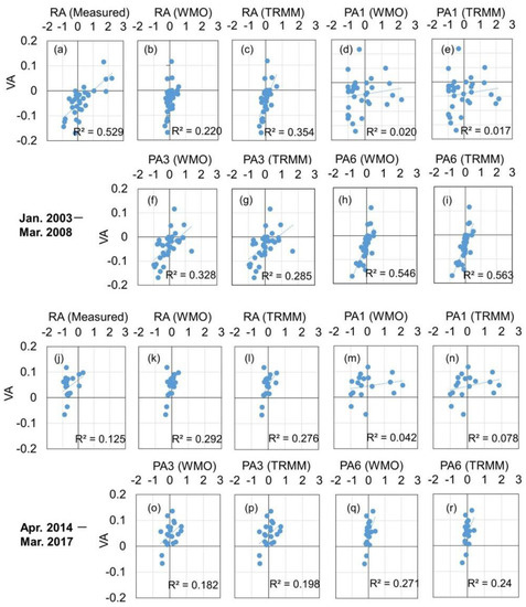 The correlation of leaf area index (LAI) anomaly (VA) with runoff anomaly (RA) and multi-temporal precipitation anomaly (PA) during (a–i) 2003–2008 and (j–r) 2014–2017.