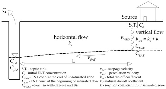 The suggested methodology for determining the die-off coefficient of the enterococci in the conditions of transport through the karst aquifer consists of two basic steps (Figure 2). Preliminary analysis, as the initial step of the methodology, serves for making specific assumptions regarding detection of what triggers enlarged ENT concentrations on the analysed wells, as well as regarding potential source of pollution. Information from the preliminary analysis were a basis for making an analytical transport model which is the second step and the backbone of the suggested methodology. The goal of the analytical model was to determine the dominant factor in the process of natural removal of ENT by transportation through a karst catchment. The model consists of two parts of the pollution transport process. The result of the first part (vertical component of the flow) was the value of ENT concentration at the end of the unsaturated zone, . In the second part, based on the known ENT concentration in the wells, by inverse procedure, the value of ENT concentration at the beginning of horizontal flow part () was calculated.