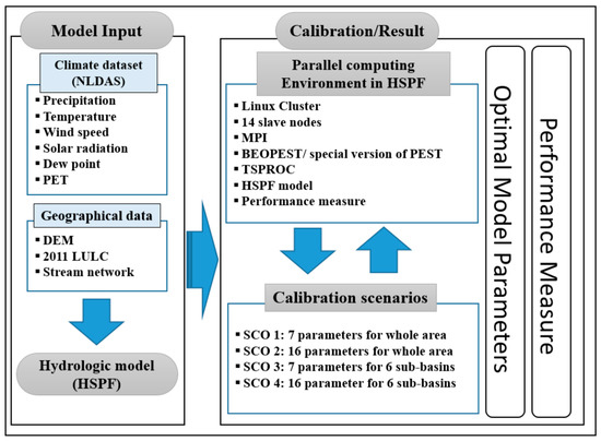 There are two typical approaches to parallelize hydrological simulations. First, a parallel algorithm with parallel threads (e.g., multiple cores) within a single computer is one approach [19,20,21,22,23]. The other approach is implementation of a parallel algorithm in connection with multiple machines [24,25]. Although several studies have been conducted for parallelizing model calibrations to reduce execution time and effort using multiple threads in a single machine [26,27,28], few studies focus on quantifying how multiple machines associated with cluster-based computing architecture can improve model performances in the field of hydrology. Moreover, computer parallelism on a cluster-based framework has not been fully implemented to find optimal parameters for hydrological simulations, especially Hydrological Simulation Program–Fortran (HSPF) modeling settings. Therefore, this research explores how computer parallelism can be implemented to evaluate the enhancement of hydrological simulations using HSPF so that hydrologists can apply it to their own applications.