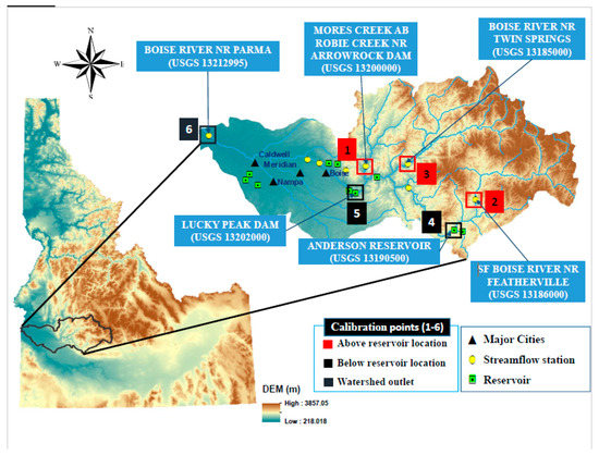 The Boise River Watershed (BRW) is selected as the study area (Figure 2). As a tributary of the Snake River system, the BRW plays a key role of providing water to the Boise metropolitan areas, including Boise, Nampa, Meridian, and Caldwell. The drainage area of the basin is about 10,619 km2 with a mainstream length of 164 km and flows into the Snake River near Parma. More than 40 percent of Idaho residents live in this basin and 60 percent of the people reside around the floodplain. The main physiographic characteristic of the BRW is that a greater proportion of precipitation falls as snow at higher elevations. It causes the predictability of high flows due to the snow melting process, and therefore a localized flood event is often observed during late spring and early summer.