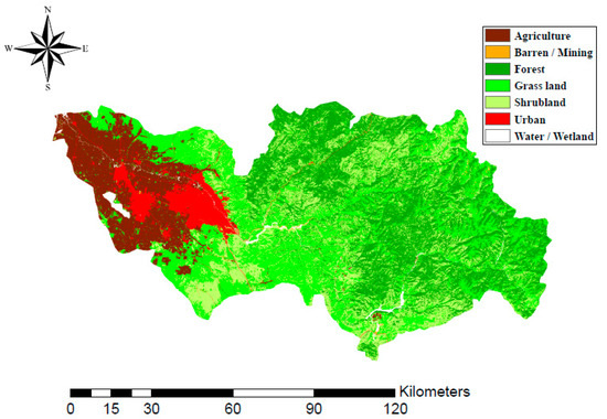 A 30 m spatial resolution interval of digital elevation model (DEM) provided by the U.S. Geological Survey (USGS) was used to delineate watersheds and to determine flow directions in BASIN 4.1 modeling platforms [29]. The National Hydrography Dataset (NHD) and DEM were then used to characterize stream routing processes at a functional sub-watershed (1:100,000). A total of six observed streamflow stations were selected for calibration target points (TPs), including three points above reservoirs (no major diversion is found), two points below reservoirs, and one point at watershed outlet (see Figure 2). Additionally, land-use/land-cover data (LULC) in year 2011 [38] was used to classify land segments, such as urban, agricultural land, forest land, water/wet land, shrub land, grass land, and barren/mining land (Figure 3). Model calibration and validation effort were then made from 1 January 1999 to 31 December 2015 (17 years) and 1 January 1979 to 30 December 2000 (22 years), respectively. Note that there was a missing period from October 1, 1997 to December 2000 at the calibration target point six (TP6) so that the period from 1 January 1979 to 30 September 1997 was used for calibration.