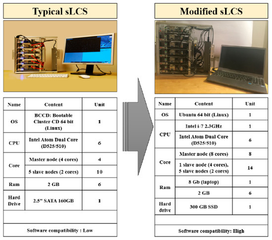 A diskless sLCS in Beowulf system was developed in Ubuntu Operating System (OS) [44]. Slave nodes with no hard disk were connected by an Ethernet network hub to the master node that could control, supervise, and monitor other salve nodes. The MPI library was used to coordinate multiple processes in a distributed memory environment. For communication protocols, the Secure Shell (SSH) method was used along with the Ubuntu-based diskless remote boot system (UDRB) to manage cluster nodes. Thus, the UDRB installed in the master node provided a diskless environment for the slave nodes, accessing local hardware. A wireless network (WiFi) was used for the master node to access the internet network, while all other connections between master and slave nodes were linked by network cards.