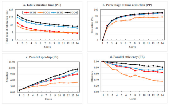 Parallel performances in sLCS are evaluated based on four different calibration schemes (SCO1–SCO4) using BEOPEST. Figure 6 shows the results of total program (calibration) run time (PT), percentage of time reduction (PP), parallel speedup (PS), and parallel efficiency (PE) by the number of core processes with respect to SCOs. Obviously, PT decreases as the number of cores increases. Note that PT of SCO4 is about ten times longer than that of SCO1 when a single core is used with the seven parameters (not shown in this paper). However, when model calibrations are conducted using two to eight cores, PT gradually decreases until no distinct improvement is observed at nine cores and above. The PP also shows a similar pattern in the sense that calibration with multiple cores can have time saving advantages. Therefore, the reduction rate of the total calibration time (PP) is achieved for 76%, 89%, 89%, and 90% from SCO1, SCO2, SCO3, and SCO4, respectively.