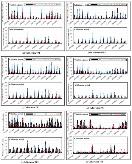 Hydrograph comparison at the calibration target points (TP1 (a), TP2 (b), TP3 (c), TP4 (d), TP5 (e), TP6 (f)) between the simulated flows (before and after calibration) and the observed flows for the validation period (1981–2000) and calibration period (2001–2015) using HSPF in sLCS.