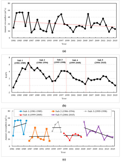 Time series of (a) annual streamflow, (b) the Rescaled Adjusted Partial Sums (RAPS) for annual streamflow, and (c) annual streamflow with trend lines for the subsets of the simulation periods, 1981–2015.