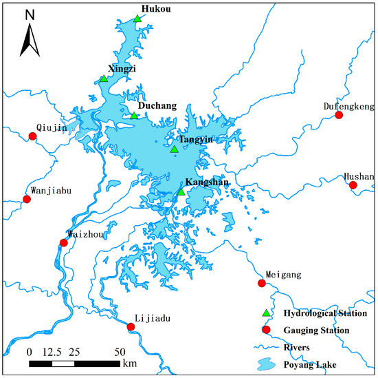 Located in the middle and lower reaches of the Yangtze River on the south shore, Poyang Lake is the largest freshwater lake and an important ecological function protection area in China. The length of the lake from north to south is 173 km, and mean east-west width is 16.9 km, with a maximum of 74 km and a minimum of 2.8 km. Poyang Lake watershed covers an area of 16.2 × 104 km2, representing 97% of the area of Jiangxi Province and 9% of the area of the Yangtze River watershed [27]. Poyang Lake receives inflows from the Gan River, Fu River, Xinjiang River, and Xiushui River (the “Five River”) and in turn, discharges to the Yangtze River through Hukou County, Jiangxi Province. There are five monitoring hydrological stations at the lake, which are Hukou Station, Xingzi Station, Duchang Station, Tangyin Station and Kangshan Station from the north to the south (Figure 1) [33]. The five monitoring hydrological stations record the water levels of their own respective jurisdiction in Poyang Lake each day. The water level fluctuates naturally with drought and wet cycles in different seasons with an average depth of 8 m and a high degree of seasonal variation. It varies remarkably from several thousand km2 in summer to less than one thousand km2 in winter. Poyang Lake forms a heterogeneous landscape with rivers, lakes, and beaches. The vegetation of Poyang Lake is abundant, with reeds, silver grass, Carex, and submerged vegetation from the lakeshore to the middle of the lake. Every winter, hundreds of thousands of migratory birds come to Poyang Lake to overwinter. It is mentioned that 95% of the Siberian crane around the world overwinter in Poyang Lake. Thus Poyang Lake is called a “Paradise of Migratory Birds”, “Second Great Green Wall in China”, and “Kingdom of Siberian crane”, all of which make Poyang Lake National Nature Reserve world-famous [27].