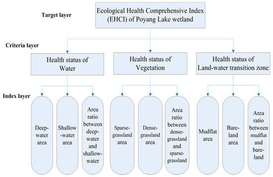 Referring to other lake ecosystem health assessment methods, the health assessment indicators of Poyang Lake contain three layers, including the target layer, criteria layer and index layer. The target layer is to reflect the overall health status of Poyang Lake, which is expressed by the Ecological Health Comprehensive Index (EHCI) of the wetland. The criterion layer is used to reflect different aspects of the target layer, namely, the attribute and level of the health status of Poyang Lake wetland. Meanwhile, the criterion layer is the key layer for selecting the evaluation elements for the index layer. We take the health status of the water, vegetation and land-water transition zone as the criterion layer. The index layer is composed of several indicators under the guidance of the criteria layer. The overall distribution and internal structure are taken into account based on the defined criterion layers and information extracted from the criterion layers. The index layer consists of six wetland landscape distribution areas and their area ratio. To sum up, there are three evaluation indicators in the criteria layer and nine evaluation indicators in the index lay to establish the health assessment index system in Poyang Lake (seen in Figure 2).