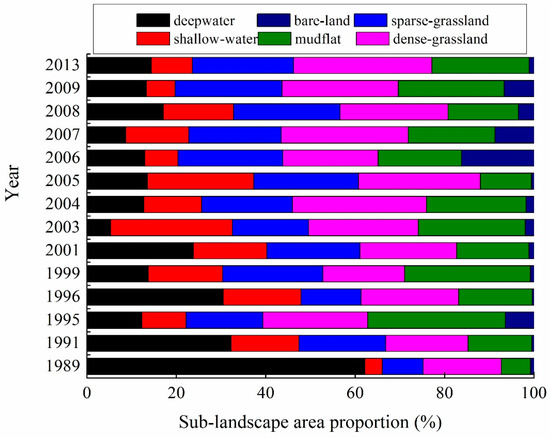 The area proportion of the 6 landscape at the Poyang Lake wetland during 1989–2013.