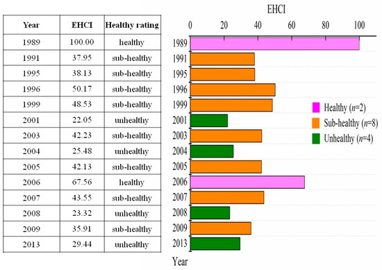 According to the structure of the Poyang Lake Ecological Health Index (EHIC) (Figure 2), we use formula (2) to calculate the EHCI of Poyang Lake wetland during 1989–2013. The EHCI of each year is shown in Figure 4. The annual EHCI was 100 and 67.56 in 1989 and 2006 respectively, which are both bigger than 60, indicating that the health status of Poyang Lake wetland was healthy in these two years. There are four years where the EHCI (e.g., 2001, 2004, 2008 and 2013) is less than 30, indicating that the health status of Poyang Lake wetland was unhealthy in those four years. There are eight years where the EHCI of Poyang Lake wetland is in the range of 30 to 60, which indicates that the health status of Poyang Lake wetland was all sub-healthy. In total of 14 sampling years during 1989–2013, the number of healthy years accounts for 14.29%, unhealthy years accounts for 28.57%, and sub-healthy years accounts for the maximum proportion of 57.14%. The maximum EHCI of Poyang Lake wetland was 100 in the year of 1989, while the minimum EHCI was 22.05 in the year of 2001. Thus Poyang Lake wetland was the most healthy in 1989 and the most unhealthy in 2001.