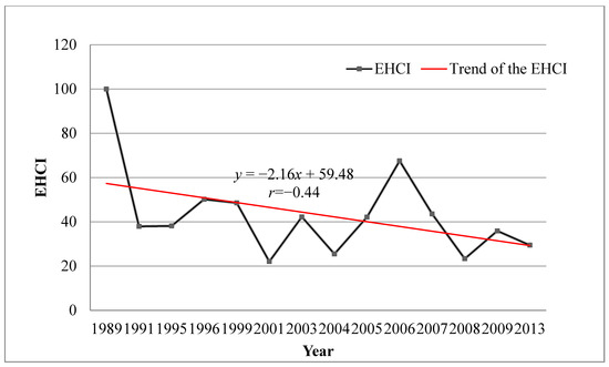 The EHCI of the Poyang Lake wetland and its trend during 1989–2013.