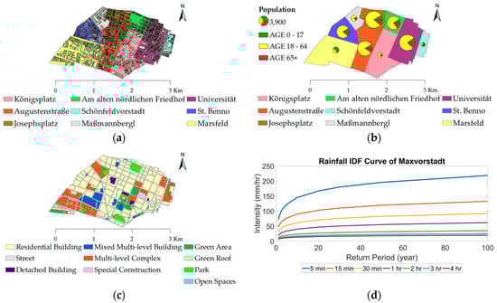 (a) Location of the nine districts and buildings within Maxvorstadt; and (b) demographic structure with age distribution of Maxvorstadt. The size of the age pie chart is proportional to the population amount. (c) Land use map of Maxvorstadt; and (d) Rainfall Intensity Duration Frequency curve of Maxvorstadt. Data retrieved from KOSTRA-DWD-2010R database (Grid no. 92049) containing information from 1951 to 2010. This paper applies the 15 min duration rainfall events for various return periods.