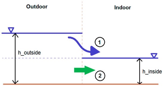 Figure 3 diagrammatizes the flow dynamic of water coming into the building. The flow should be analyzed by the upper and lower portion. At the upper portion of the flow, the income discharge is calculated by Equation (15), which describes a free discharge under a head of water equal to . At the lower portion of the flow, the income discharge is calculated by Equation (16), which describes a submerged discharge under a head of water equal to . [m3/s] and [m3/s] represent the upper and lower portions of the discharge, respectively. stands for the discharge coefficient, which in this case is assigned a value of 1. (m) is the width of the door, assumed to be 0.75 m. Variable (m) and (m) represent the outdoor and indoor water level, respectively.
