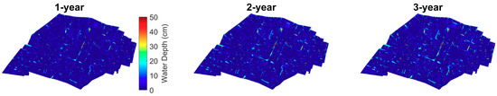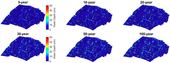 According to the results of the maximum inundation modelling (see Figure 4), it can be shown that the scenarios with higher return period as well as rainfall intensity return larger inundation areas and higher water depths. The average water depth on streets also shows an increasing trend as the return period increases (see Table 2), which corresponds to the shape of the considered 15 min rainfall intensity–frequency curve in Figure 1d. In the maximum inundation maps, there are several spots showing a small area of higher water depths. The reason is that these are areas enclosed by buildings or tunnels, which have a lower elevation than the surroundings. The surface runoff modelling applying the P-DWave model only includes the overland surface routing of rainwater. Hence, in this case, it is not possible to model the underground drainage of water accumulated at the low-laying areas. According to the maximum indoor water depth results (see Figure 5), the percentage of buildings which face a more severe indoor flooding rises as the return period increases.