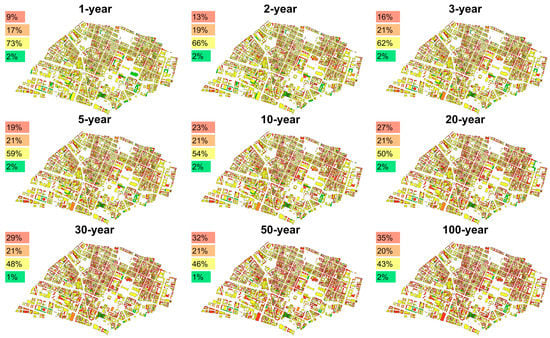 Maximum indoor water depth modelling given flooding events with various return periods by applying the one-way coupling computation. The indoor water depth in buildings with color green: 0 cm, yellow: 0–5 cm, orange: 5–10 cm, and red: above 10 cm. Percentage stands for the amount of building in each level of indoor flooding.