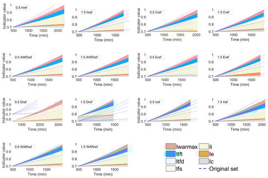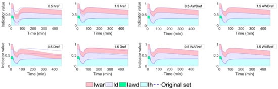 A sensitivity analysis for the reference parameters is conducted for the building which encounters the most severe indoor inundation caused by a 100-year flooding in district Königsplatz. The alteration of each indicator by changing its corresponding reference parameter is examined by comparing the case of adding and subtracting 50% from the original values of the reference parameter. The differences can be detected by comparing the case applying the original set of reference parameters (shown in blue dashed lines) and the upper edges of the areas. The results of the sensitivity analysis in the event (see Figure 6) and recovery phase (see Figure 7) are shown below.