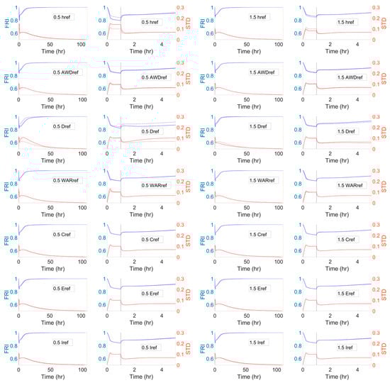 Figure 8 shows the mean FRI curves as an aggregated result for every household in Maxvorstadt according to different reference parameters (either by adding or subtracting 50% from their original values) considered in the sensitivity analysis. In addition, the standard deviation curves are provided to illustrate the level of dispersion of the FRI at each timestep.