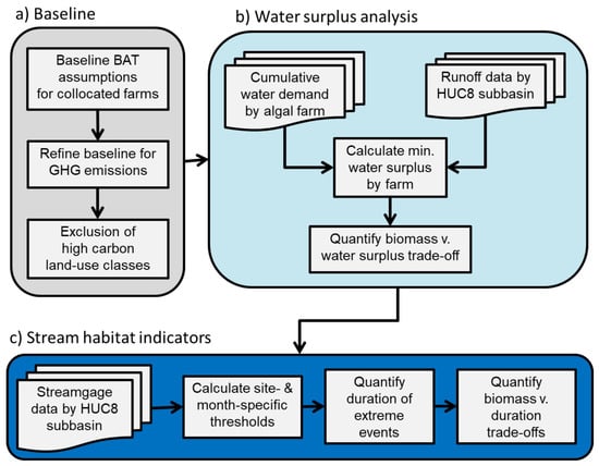 Process used to assess the marginal sustainability outcomes for increased water demand associated with algae production. Primary steps included (a) establishing a low-carbon baseline, (b) defining and assessing how thresholds for minimum water surplus influence potential US algae production, and (c) assessing the duration of extreme low-flow and high-temperature events in representative streams.