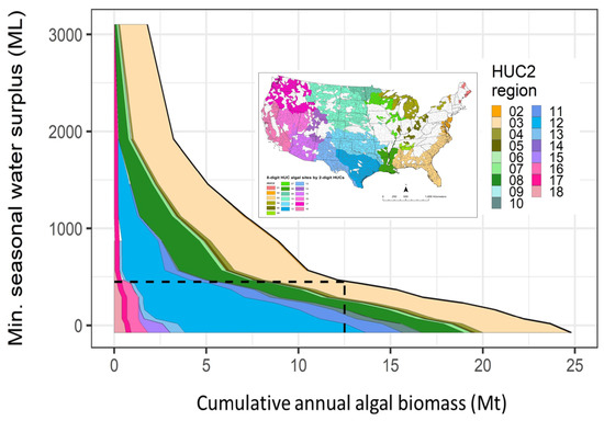 Simulated algal production declined from 24.8 Mt to 1.8 Mt as the threshold for minimum seasonal surplus freshwater increases from a deficit of 74 ML to a surplus of 3106 ML. The dotted lines show the total annual biomass of around 12.5 Mt when restricting within-subbasin algae development such that a surplus of 450 ML remains. Colors of HUC2 basins in the inset map correspond with stacked curves.