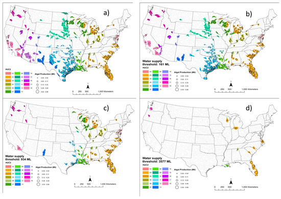 We identified spatial patterns in the areas where algae production remains possible for different minimum water surplus thresholds. Clearly, some HUC8 river basins could offer a more-sustainable combination of algae productivity and water availability than others. However, in more arid regions, where water is overallocated, alternative production methods may be needed to supply biofuels. For example, photobioreactors are an alternative with lower evaporation rates than production in open ponds, but they are more expensive to operate. Furthermore, photobioreactors can allow production in basins with plentiful water and in cooler climates (if waste heat from industrial processes is used) [72]. Finally, replacing potable with non-potable water sources could, by one estimate, save 90% of freshwater requirements [24]. Municipal wastewater use is another sustainable option for water-constrained regions [30,73]. In addition, tens of millions of tons of algae can be produced from saline waters in the US under similar CO co-location constraints as in this study and using Nannochloropsis salina as the model strain [6,47,74]. However, saline biomass has additional costs [75,76] including those associated with developing infrastructure and disposing of wastewater.
