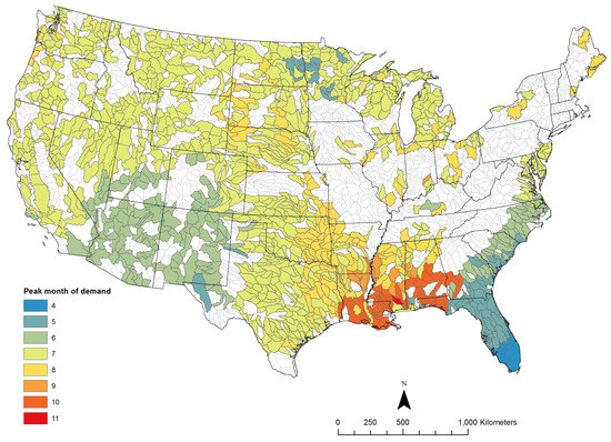 Above we focused on the seasonal minimum surplus, regardless of when (seasonally) that surplus was at a minimum. The timing of water demand also varied geographically (Figure 4). Although summer was the season with peak algae production in most of the conterminous US, subbasins surrounding the Gulf of Mexico (other than Florida) showed peak production in fall, whereas subbasins in Florida peaked in early spring (Figure 4). We projected peak production for the southwest and areas along the southeast Atlantic coast in June (Figure 4).