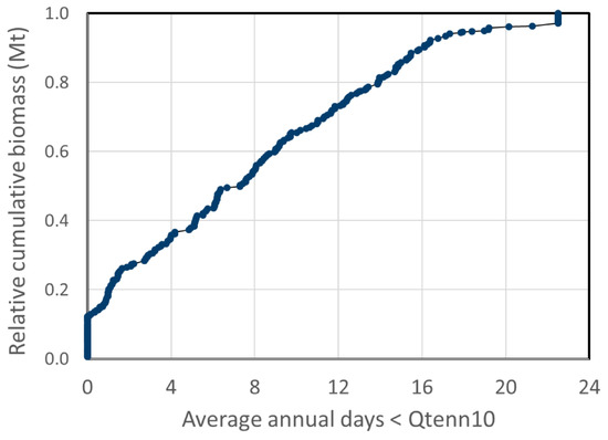 Low-flow events ranged in duration from zero to a full month (average of 13 days) (Figure 5). In general, when we restricted attention to those HUC8’s with a duration of zero for flows below Qtenn10, the proportional reductions in available biomass were large (Figure 5). Restricting algal development where the minimum water surplus was above 450 ML reduced the available potential biomass by half to roughly 12.5 Mt. Similarly, restricting the duration of low-flow events (<Qtenn10) to 12 day reduced biomass by roughly 75%.