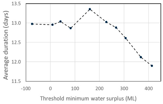 Change in the duration of events below low-flow threshold Qtenn10 as the threshold for minimum seasonal water surplus increased.
