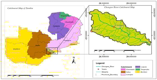 - Jenkins, M.; Nick, A.; Mwelwa, D.; Simwana, T. Groundwater Resources for Lusaka and Selected Catchment Areas—Technical Report No. 1—Impact of Small Scale Farming on the Chongwe River on Land Use and Water Abstractions from Chongwe River; Water Resources Management Authority and German Federal Institute for Geoscience and Natural Resources: Lusaka, Zambia, 2015. [Google Scholar]
