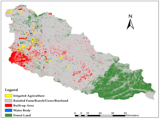 Physical data inputs were land use/land cover data and soil physical properties of the catchment. The land use/land cover data were generated from the United States Geological Survey (USGS) Landsat 8 Operation Land Imager (OLI) using an Earth Resource Data Analysis System (ERDAS Imagine) 2014 and analyzed using ArcMap 10.3 [22,23]. The maximum likelihood classification algorithm was used to classify the catchment into five land use classes as shown in Figure 3. Table 3 shows the land use/land cover class distribution for the years 1984 and 2017. Land use data were important in WEAP to imitate the hydrological relations between the soil, atmosphere, and runoff. It was vital in the algorithm for computing evapotranspiration.