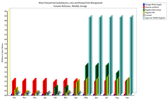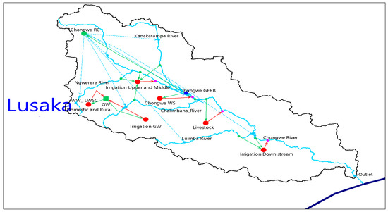 The Chongwe River catchment boundary was delineated using WEAP catchment delineation mode and the generated schematic map further refined from a GIS based vector map of the Chongwe River catchment area and river network. To model the Chongwe River catchment in the WEAP, further datasets consisting of tributary streamflow data and groundwater data analyzed from 802 boreholes using GeODin software were obtained. Six groundwater demand nodes were created in the WEAP for the demand analysis of the Chongwe River catchment and computation of the recharge, abstraction rate, and volume. Note that each demand node represented a specific group of water users. The six demand nodes in this study represented (1) irrigation demand for upper and middle part, (2) irrigation demand for downstream, (3) domestic demand for urban and rural water use, (4) water demand for Chongwe Town water supply, (5) livestock water demand, and (6) irrigation water demand from groundwater. As shown in Figure 5, all the six water demand nodes depended on water from the catchment surface and groundwater resources. The time step for the WEAP model was based on calendar month with the hydrological year starting in the month of October and ending in September (Figure S1, Supplementary Materials).
